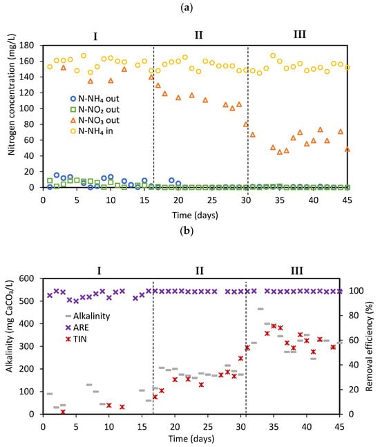 Overall performance of the system: (a) nitrogen concentrations in the reactor influent and effluent; (b) effluent alkalinity, total inorganic nitrogen (TIN), and ammonia removal efficiency (ARE).