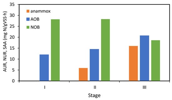 As the distribution of AOB, NOB, and anammox significantly impacts the performance and efficiency of the PN/A [], batch tests assessing the activity of these three main functional groups were employed (Figure 3).