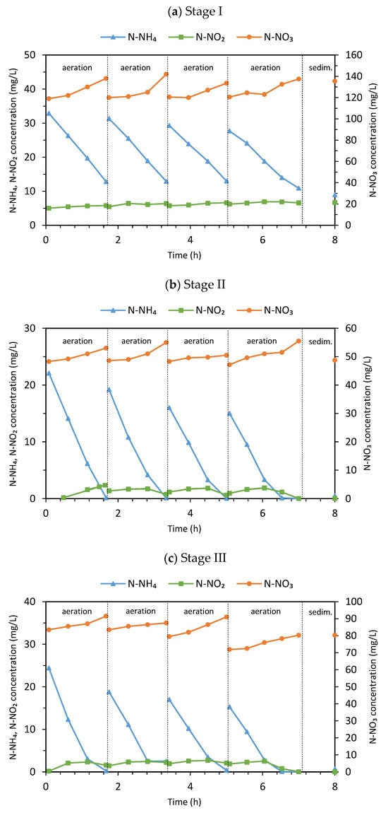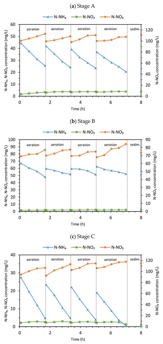 Before starting Stage II, 3 additional research stages (A–C) lasting 1 day were designated in order to assess the impact of a short-term change in the DO concentration on the effectiveness of the nitrification process. Each stage involved analysis of the nitrogen conversion in one cycle.