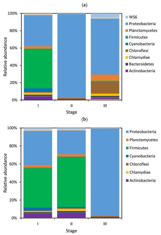 Relative abundance of the microbial community structure at the phylum level during: (a) Stages I–III, (b) Stages A–C.