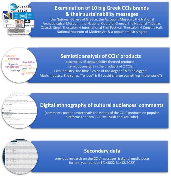 This study uses both qualitative and quantitative methodological tools in order to gather, analyze and interpret data regarding the role of some of the biggest Greek CCIs as trustworthy communicators of messages on sustainability and, specifically, green tourism. The methodological tools used in this research, as shown in Figure 1, include the examination of the big CCI brands in Greece (the 10 cultural organizations, as well as cultural and creative spaces that welcome the biggest number of tourists in Greece) regarding their green messages (e.g., on World Environment Day), semiotic analysis of a number of Greek CCIs’ products on sustainability and digital ethnography of the comments that were posted underneath the videos of the CCIs’ products in the digital environment and especially on popular platforms for each CCI, like IMDb and YouTube. In addition, secondary data from the author’s previous research on Greek CCIs’ messages and digital media posts for a one-year period (1 January 2022–31 December 2022) were added to the present research data.