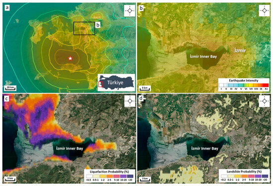(a) Location of the study area (see the red rectangle in the Country Map) and shake map contours of Samos Earthquake (the epicenter is located in the red asterisk) (b) earthquake intensity around İzmir, (c) liquefaction probability map, (d) landslide probability map (modified from USGS (2020). United States Geological Survey Earthquake Hazards Program, “M 7.0–13 km NNE of Néon Karlovásion, Greece” event page. Available at: https://earthquake.usgs.gov/earthquakes/eventpage/us7000c7y0/executive, accessed on 15 June 2023).