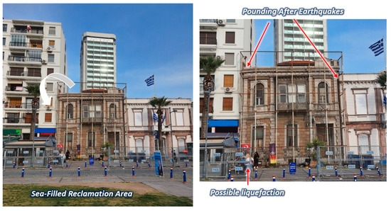 Traditional construction practices are considered outmoded, insubstantial, and indicative of poverty in developing towns [60,61,62]. As a result, people are moving away from traditional types and methods of construction and adopting modern practices and types of buildings with bricks, cement blocks and/or stones [57,63]. Masonry buildings, as they are known, are extremely vulnerable to earthquakes. In İzmir, there are many old buildings in Old İzmir, Kemeraltı, Kordon, Alsancak, and Karşıyaka, which were built in the first years of the Turkish Republic, were later restored and preserved but damaged by earthquakes and are still in risky condition (Figure 4). For this purpose, these structures realized according to newer regulations should be analyzed by classifying them separately.