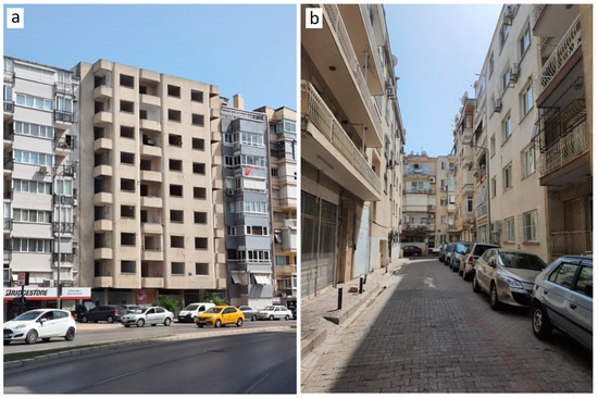 (a) A building undergoing urban transformation and (b) narrow streets in Karşıyaka district.