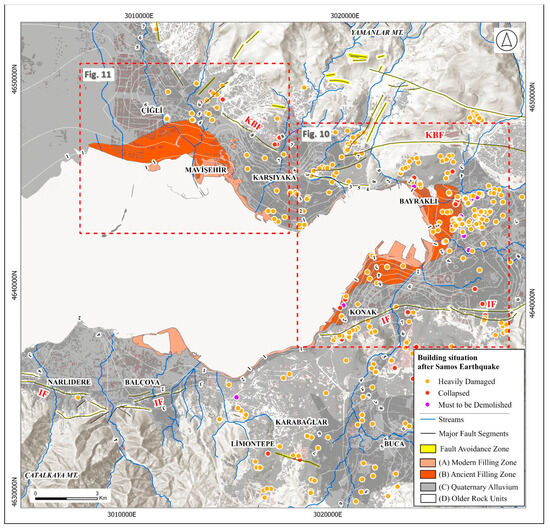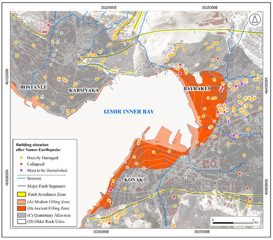 - Nuhoğlu, A.; Erener, M.F.; Hızal, Ç.; Kıncal, C.; Erdoğan, D.Ş.; Özdağ, Ö.C.; Akgün, M.; Ercan, E.; Kalfa, E.; Köksal, D.; et al. A reconnaissance study in Izmir (Bornova Plain) affected by October 30, 2020 Samos earthquake. Int. J. Disaster Risk Reduct. 2021, 63, 102465. [Google Scholar] [CrossRef]