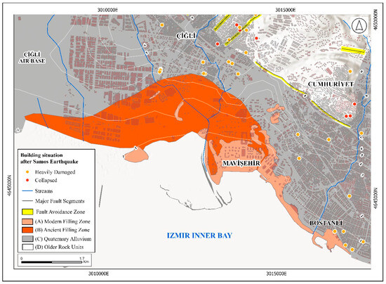 - Damaged and collapsed building data digitalized from the earthquake damage assessment studies of the Ministry of Environment and Urbanization of the Republic of Türkiye, the Samos earthquake reports, and findings in the field studies of Authors [45,52]. Buildings were obtained by the Urban Planning Department of the İzmir Metropolitan Municipality.