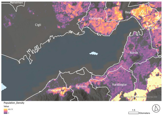 Unfortunately, the increasing demand for housing in districts such as Karşıyaka, Konak, and Buca, where the population is large and where people prefer to settle for social and economic reasons, caused a density in buildings and construction (Figure 5). However, an urban area’s building density significantly impacts its structural vulnerability [17,73]. The more densely built a place is, the more vulnerable it is to earthquakes. The density has been calculated in each block as a ratio between the volume of buildings and the plot size.