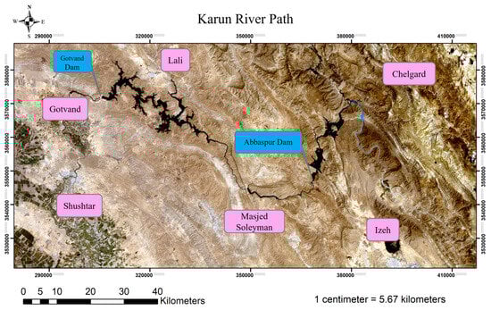 Figure 2 shows a comprehensive view of the neighboring cities. The northeastern dams of Khuzestan Province are also shown in Figure 2. The Abbaspour Dam, also known as the Karun 1 Dam, is one of the largest dams in Iran, showing a total stored volume of 3140 km3. Located approximately 50 km northeast of Masjed Soleyman in Northern Khuzestan, it is a double-curve concrete dam. The construction of this dam, one of the earliest dams in Iran and the Middle East, began in 1965 and continued until 1975 [20,22].