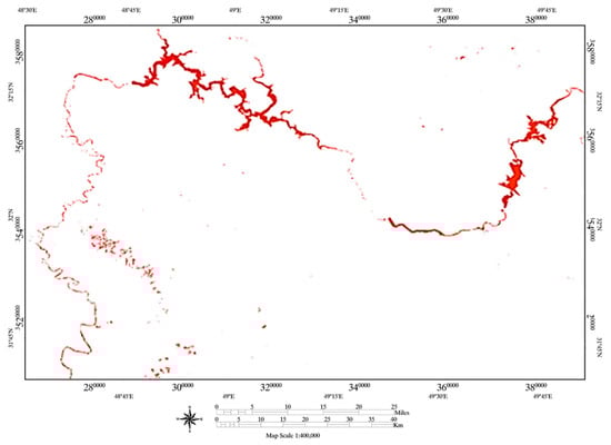 There are many features in different scenes of the image, such as urban, agricultural, mountainous, and aquatic areas. A manual profile of temperature fluctuations along the dam and river course was accomplished by selecting water pixels, constituting a non-systematic method. In addition, the width of the river, which ranges from 150 to 300 m, increases the likelihood of selecting non-water pixels, especially in areas where the river’s width is less than three pixels. Therefore, in order to decrease the human error associated with the incorrect selection of pixels along the longitudinal profile drawing, it is essential to apply a masking operation to separate non-water features from water features. For this reason, the generated water mask in Figure 5 was transformed into a binary image using a threshold, as shown in Figure 7, to separate non-water areas from water areas.