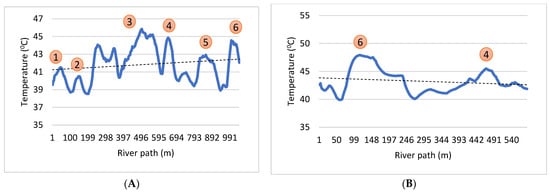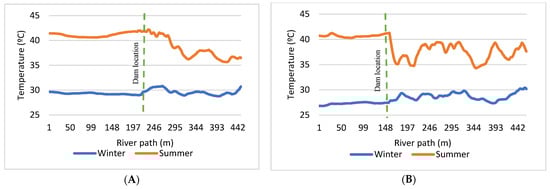 Profiles of the temperature changes caused by the urban areas and industrial areas (Shushtar) (according to Figure 11A) and their average temperature trends. (A) Changing water temperatures in relation to Landsat-8 imagery in 2019. (B) Changing water temperatures in relation to Landsat-5 imagery in 1999.