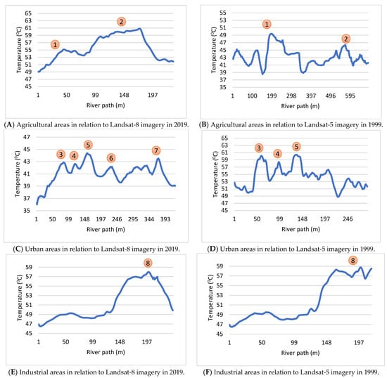 To complement the visual interpretation of the thermal pollution maps of urban, agricultural, and industrial areas shown in Figure 11, temperature change profiles were drawn according to the identified regions in Figure 12 and Figure 13. The process of drawing temperature change profiles in 2019 and 1999 using Landsat-8 and Landsat-5 satellite imagery was undertaken to identify and compare areas along the Karun River where water temperature is unusually increasing over a 20-year period. A comparison of the temperature change diagrams and the results of water temperature changes in the Gotvand, Jannat Makan, and Shushtar areas over the 20-year period revealed almost identical patterns, indicating the continued presence of most of these pollution sources from 1999 to the 2019. According to the obtained results (Figure 12), a clear surge in the average water temperature in the river was estimated in 2019, whereas, in 1999, this increasing trend was not observed.