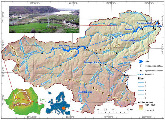General map of the hydrotechnical system of the Upper Someșul Mic (sources, [58,59]. Upper inset, the Someșul Rece Delta at the level of 2008; lower inset, its location within the Transylvania and Romania territories, and Romania’s position within the European continent [60].