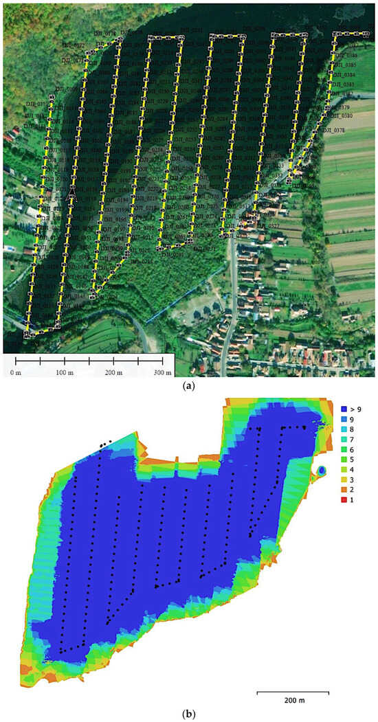 Following the characteristics of the drone objective (Phantom 4 Pro type camera), we conditioned an 85% front lap and a 75% side lap, to ensure a sufficient density of information to obtain a high-accuracy model (Figure 4a,b).