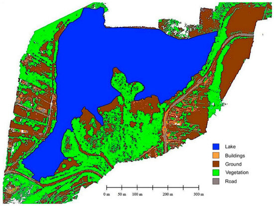 As a component of the results, following this classification, we were able to separate the points that referred to constructions, land, high vegetation, low vegetation, and roads. The spatial distribution of these distinct points is shown in Figure 7.