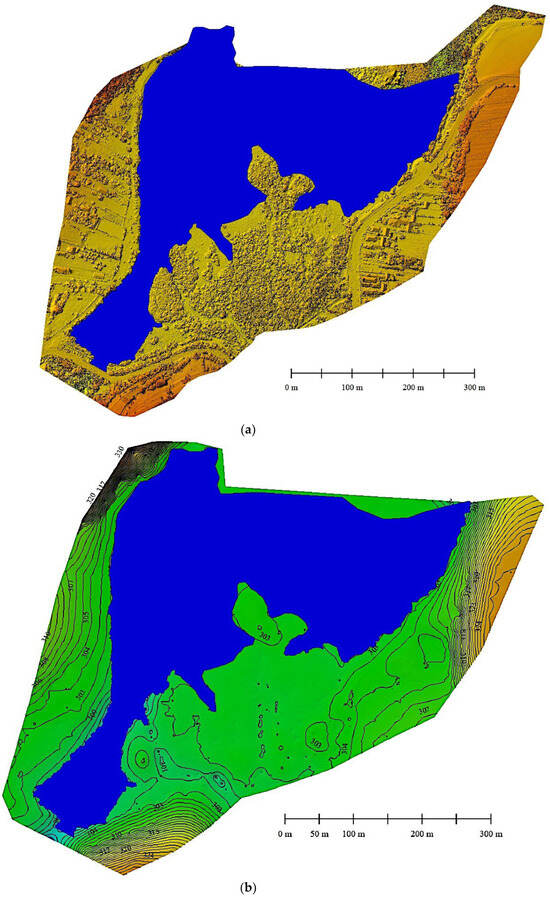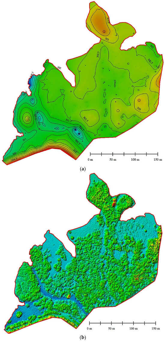 (a) Digital Surface Model; (b) Digital Terrain Model with 1 m equidistance of contours.