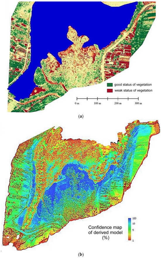 (a) NDVI index of study area; (b) confidence map (%) of derived model.