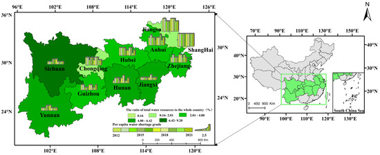 The YREB is an inland economic belt with global influence; a coordinated development belt for interaction and cooperation in the eastern, central, and western regions of China; an inward and outward opening belt with comprehensive advancement along the coast and along the river and the border; as well as a pioneering demonstration belt for ecological civilization construction. It covers nine provinces and two cities, spanning three regions including Eastern China (Shanghai, Zhejiang, and Jiangsu), Central China (Anhui, Jiangxi, Hubei, and Hunan), and Western China (Sichuan, Chongqing, Yunnan, and Guizhou). The area is about 2052.3 square kilometers, accounting for 21.4% of the total area of the country, and the population and GDP comprise more than 40% of the country. The YREB has a good water resource endowment, and its total water resources account for about 44% of the total water resources in the country. However, due to its large population, its per capita water resources comprise lower than 25% of the world’s average. According to the 2012–2021 China Water Resources Bulletin and the Water Resources Statistics Bulletin of each province, the total water resources of the Sichuan, Hunan, Yunnan, and Jiangxi provinces account for a higher proportion of the whole country’s total water resources in the past ten years. Simultaneously, in terms of per capita water resources, the province’s per capita water resources in most years are in a state of mild and above (moderate, severe, and extreme) water shortage, while Shanghai has been in extreme water shortage (less than 500 m3) during the past decade (as shown in Figure 1). In addition, the rapid development of industrial and agricultural production and urban construction has led to frequent water environment pollution in the basin and prominent water ecological risks. However, under the guidance of policies such as the Action Plan for the Protection and Restoration of the Yangtze River, the Action Plan for the Prevention and Control of Water Pollution, and the Strictest Water Resources Management System, the YREB has preliminarily improved in water resources control and water ecological environment. It is still facing challenges in the conservation and intensive use of water resources and in the management and protection of the water ecological environment.