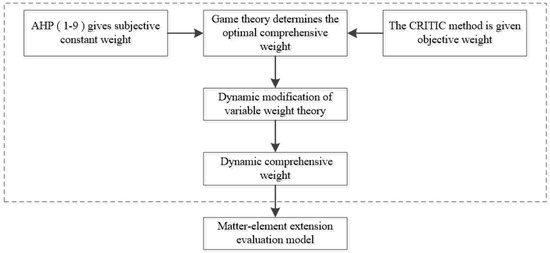 The matter–element extension evaluation model of this paper is based on the traditional matter–element extension evaluation model. Firstly, the game theory model is used to minimize the deviation between the subjective and objective weights. Secondly, combined with the variable weight theory, according to the actual value of each index, the determined comprehensive weight is dynamically modified to obtain the dynamic weight of each index. The flow chart of the comprehensive evaluation model is shown in Figure 2.