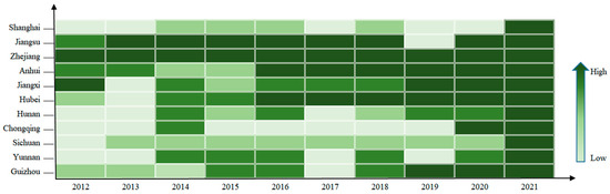 Overall, between 2012 and 2021, the WET performance level became better from the west to the east. Among these, the proportion of provinces with low and relatively low values was decreasing, while the proportion of provinces with moderate values and above was increasing. The provinces with moderate values and above were roughly characterized by “scattered distribution–group distribution–connected distribution”. In 2012, the proportion of provinces with median and above WET performances was 45%, while the proportion of provinces with median and above performances had reached 91% by 2021. Locally, the WET performances of Sichuan, Hubei, Hunan, Jiangxi, and the provinces in the Yangtze River Delta region showed continuous improvements, while the WET performances of Yunnan, Guizhou, and Chongqing showed fluctuating states.