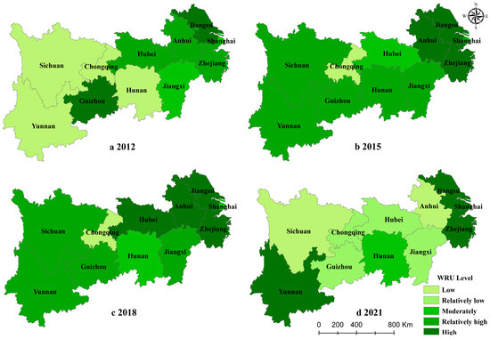 Figure 4. Spatial distribution of WRU in the YREB in the 2012–2021 period.