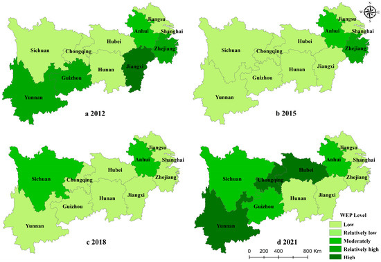 Figure 6. Spatial distribution of WEP performance levels in the YREB in the 2012–2021 period.