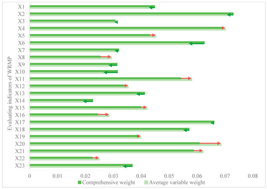 Figure 7. Evaluation index weight change comparison chart.(Note: The green arrow to the left represents that the average variable weight of the index in ten years is less than its comprehensive constant weight part; the red arrow to the right represents the part of the average variable weight of the indicator in the ten years that is greater than its comprehensive constant weight.)