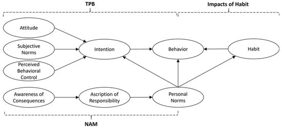 Most recently, Klöckner and Blöbaum proposed and tested the Comprehensive Action Determination Model (CADM): the model combines and utilizes TPB, NAM, habits, as well as some objective situational constraints and facilitators to explain sustainable behaviors [43]. It argues that pro-environmental behaviors are influenced by intentional, habitual, and situational forces; additionally, intentional and habitual forces are in turn affected by normative processes like social or personal norms. In short, the theory incorporates the indirect normative impacts and the direct intentional, habitual, and situational impacts on sustainable behaviors. Acknowledging the need to combine all three main streams of research into a clear, coherent, and comprehensive framework and inspired by the CADM of Klöckner and Blöbaum [43], our paper proposes a simplified research model (Figure 1) with the following hypotheses: