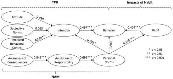 We propose a model (Figure 1) which combines habits with TPB and NAM constructs, and we adopt the SEM approach [58,59], conducting a CFA to check the measurement model. As the construct “behavior” contains one single item, its reliability and validity have not been tested and it has been considered as an observed variable [75,76].