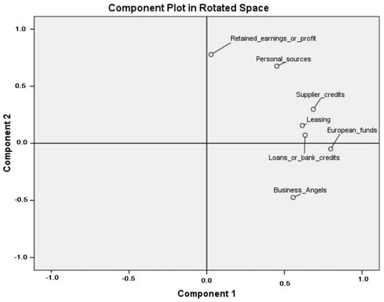 The obtained data were processed using the SPSS program, employing various data analysis methods. The selected data analysis techniques were aligned with the study objectives. To achieve this, IBM SPSS Statistics 26 was used for estimating descriptive analysis and illustrating respondent characteristics. Statistical and descriptive indicators were employed, including the mean, median, frequency, and standard deviation methods [126,127,128,129]. To understand the pattern of the entrepreneurs’ reactions regarding the funding sources, the Principal Component Analysis—PCA (a method that belongs to multivariate data analysis) was used. In order to complete the analysis, we used the correlation matrix, Varimax rotation method and the Graphical Representation of the Association between Variables and Factors.