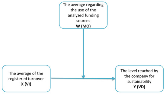 - The average regarding the use of the analysed funding sources (which represents W (MO))—this indicator has been created by calculating the average for the values registered in the following question: “To what extent do you think that the funding sources available to the company are used?.” The scale includes 7 variants (representing the 7 analysed funding sources, namely: Profit, Equity, Supplier Credit, European Funds, Bank Credit, Leasing and Business-Angels), assessed on a 5-point Likert scale, from 1 (“the least used”) to 5 (“the most frequently used”).