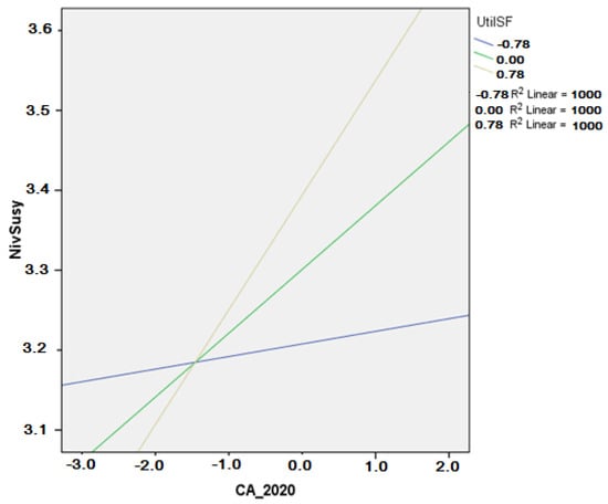 In order to test the moderating role of the relationship between the level of sustainability of companies and their turnover, moderated by the level of the use of the funding sources (Hypothesis H3), model 1 of the Hayes PROCESS macro for SPSS [130,131] was used. We chose the PROCESS macro over SEM because it is a more recent method for data analysis, which provides a graphical description of moderate correlations. In addition, this approach generates a moderate mediation index that indicates whether the study model should be accepted or rejected. All calculations of statistical indicators were performed in SPSS, being calculated: , F test, Coefficients β, Standard Error, t test, p value, Coefficient Effects. In order to sketch and develop the moderation link, a regression function was created which shows that the global regression is statistically significant (= 0.100, F (3, 263) = 9.703, p = 0.000).