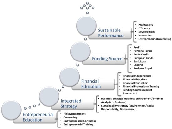 In the specialised literature, different methods of implementing sustainability strategies are presented, depending on the geographical area in which the entrepreneurs operate [19,20,21,22,23,24], the areas of business approached [25,26,27], or the integration of the pillars of sustainable, economic, social, and environmental development in the implemented strategy [20].