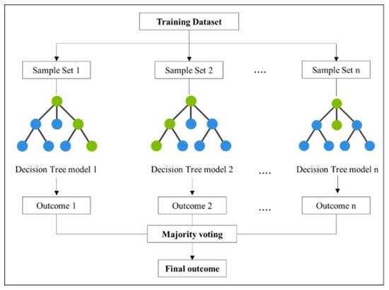 The Random Forest Regression is a supervised learning algorithm used for regression or classification prediction []. The Random Forest algorithm takes a dataset with input features and corresponding labels or outcomes and creates a large number of decision trees, each using a random subset of the data and a random subset of the input features. Each decision tree independently makes a prediction based on its subset of data and features. When a new data point needs to be predicted, it passes through each decision tree and each tree provides its prediction. The final prediction is determined by combining the predictions from all the decision trees, usually through voting or averaging []. Figure 2 illustrates the workflow of the Random Forest algorithm.