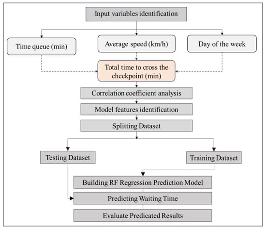 Hence, in this study, we incorporated RF regression by using historical records obtained from an extensive field survey to determine the waiting times at different mobility restrictions, which also impact on sustainability. The methodology followed to create the RF waiting time prediction model consisted of the following: (i) data cleaning and preparation; (ii) applying correlation coefficient analysis to identify the input variables (model features)—the vehicle waiting time at the queue, vehicle speed near 750 m of the checkpoint, and day of the week—based on their correlation with the output variable (time to cross the checkpoint); (iii) building the predictive model by splitting the dataset randomly into a training dataset and testing dataset (RF uses the training dataset to build the predictive model, while the testing dataset is used to predict the waiting time); and (iv) evaluating the predicted outcomes and testing the accuracy of the model. Figure 3 illustrates the methodology of creating a waiting time prediction model using RF.