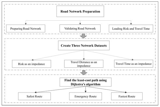 The second phase focuses on network analysis, entailing the creation of three distinct network datasets. Here, three graph models are generated, each associated with a different attribute cost—risk, travel time, and travel distance. This step serves as a preliminary stage for the application of routing analysis algorithms. In the final phase, Dijkstra’s algorithm is employed to determine the least-cost path, generating three alternative categories: safest, shortest, and fastest.