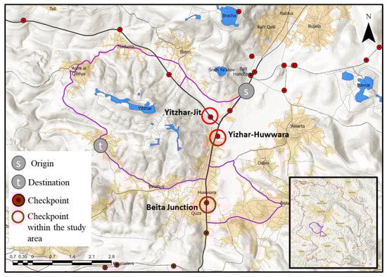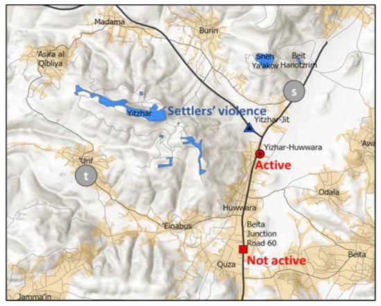 Besides the risk of settler-related violence, this area is exposed to risk-related mobility restrictions related to three checkpoints (Yitzhar–Huwara, Yitzhar–Jit, and Beita Junction), as illustrated in Figure 5. Also, the study area is exposed to various movement restrictions, such as flying checkpoints, road gates, roadblocks, and earth mounds. So, this part of the road is a good representative sample to study in terms of mobility along the road network in the WB.