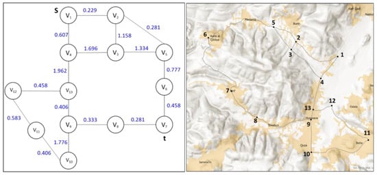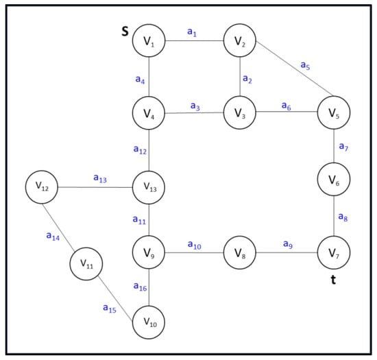 The road sample was converted into a graph model G = (V, E), where V is the set of nodes and E is the set of edges. The graph model was created using the capabilities of ArcGIS Pro 3.1. The graph comprises 16 edges (a1, a2, a3, a4…, a16) and 13 nodes (v1, v2, v3, v4…, v13), as illustrated in Figure 6.
