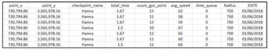 The waiting time data at the mobility restrictions was collected from the Arij Institute (Applied Research Institute–Jerusalem), which tracked 70 vehicles for six months (January–July 2018) on major routes in the West Bank with checkpoints and barriers []. More than 18.5 million records were registered and stored in a Microsoft SQL database. Due to the massive amount of data, the institute faced difficulties in retrieving the data from the server for the researchers. However, detailed CSV files for March and June were provided, containing 41,604 GPS records; each row presents the GPS record, and the columns are the captured data, including vehicle location (x,y), average speed within 750 m from the checkpoint, the creation date, the average number of vehicles in the queue, the average waiting time in the queue, and total waiting time (Figure 7).