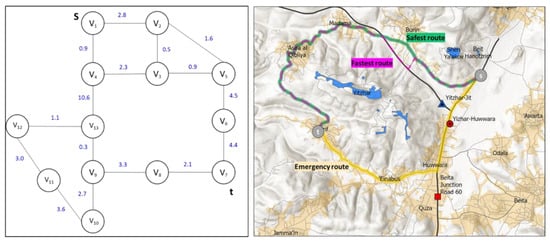 Considering the proposed scenario, the waiting time at the Yizhar–Huwara checkpoint was forecasted to be 9.5 min. Subsequently, the travel time for each edge was loaded in accordance with Equation (9), as depicted in Figure 11. After loading the risk, travel time, and distance values onto the graph edges, Dijkstra’s algorithm was applied between the starting point s and ending point t to find the three categorised routes. Figure 11 presents the results of the NA analysis.