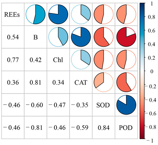 As seen in Figure 2, correlation analysis showed that the REEs had a strong correlation with chlorophyll and a moderate negative correlation with SOD activity and POD activity. There was a strong correlation between biomass and CAT, while there was a strong negative correlation between biomass and SOD and POD.