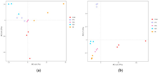 As seen in Figure 3, for the 100% clipped samples, two interroot soil fungi samples were close to each other, but one other sample deviated from the others on the PC2 axis. Individual samples in the 25% and control groups were clustered together with samples from the 75% and 50% groups.