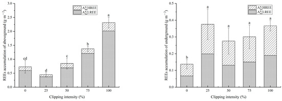 REE accumulation in D. pedata treated with different clipping intensities. Note: values followed by the same or no letters are not significantly different, and those followed by different letters are significantly different at p < 0.05.