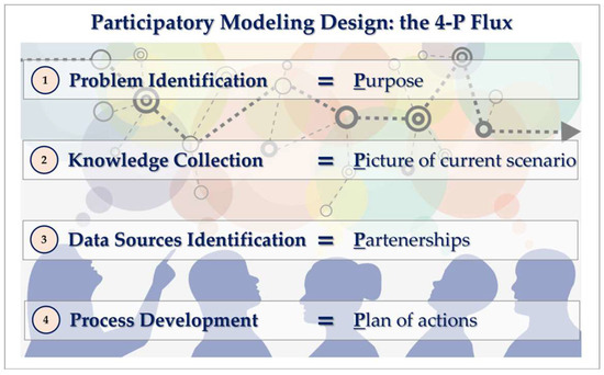 As a process-oriented approach, participatory modeling comprises three phases: problem identification, data and knowledge collection, and problem analysis. These can be approached using the 4Ps rule (Figure 2): purpose, process, partnerships, and products [38].