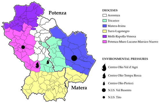 Figure 3. Map of the Basilicata region where administrative boundaries (Potenza and Matera provinces), territorial units (Dioceses), and the most significant anthropic pressures have been highlighted.