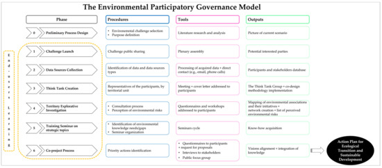 This paper explores this complex matter, suggesting an Environmental Participatory Governance (EPG) model as a flux of methodological steps to be followed for achieving the ecological transition on a regional scale. It is based on previous experience from the framework of the 49th Social Week of Italian Catholics, held in Taranto in October 2021 [24]; here, the ecological transition was faced with a trans-disciplinary approach which has taken integral ecology [25] as its paradigm. In this work, the subject of ecological transition has been investigated under the environmental profile, exploiting the Synod of the Catholic Church [26], that represents a precious opportunity for people engagement exploring participatory ways of exercising responsibility in the effort to build a more habitable world.