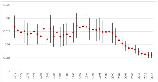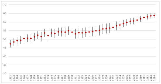 Finally, for each year, the population weighted life expectancy was calculated. Time trends for life expectancy, as well as {a}, {b}, and {c} were depicted and analyzed in linear regression over time.