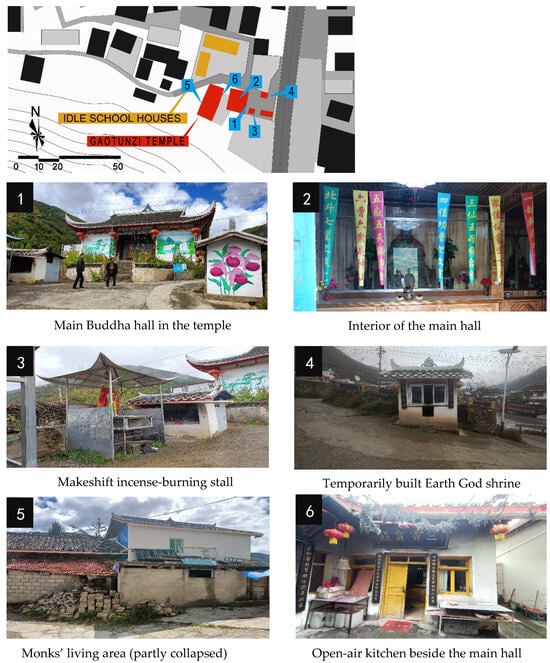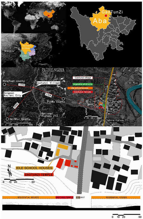 Figure 1). The overall form of the village is a clustered structure radiating outward from Gaotunzi Temple at its core. National Highway 213 divides the village into eastern and western parts, with Gaotunzi Temple located in the western half, adjacent to the national highway [