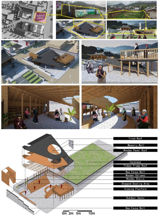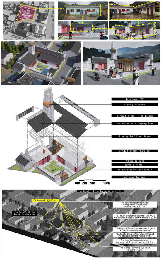 Figure 4 shows, the redesign and planning of the village respect the commanding position of Gaotunzi Temple within the settlement. Taking into account the community’s needs and renovation suggestions, the design utilizes the idle school land within the village to transform and design it into the Xue Tao Cultural Museum and Village History Museum. It integrates the temporary vegetable allotments on the southeast side to establish an activity center for the villagers. These buildings incorporate elements of faith, history, and leisure to form the core of the settlement.