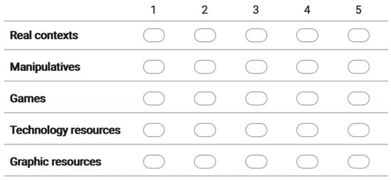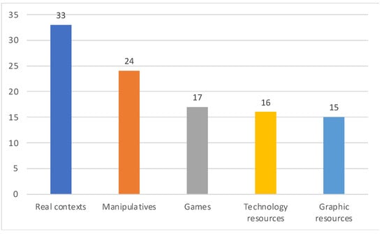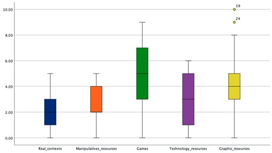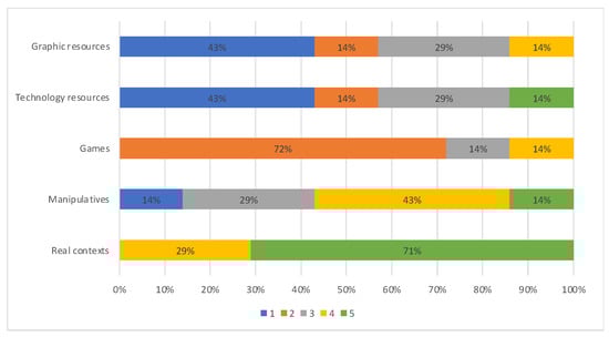 However, if we analyze the distributions of the scores for the different contexts of the MTIA, from Figure 5, we can see that teachers have more difficulties in answering those questions linked to real contexts, manipulative resources, and technological resources. On the other hand, in the questions linked to the use of graphic resources and games, they obtained a better score.