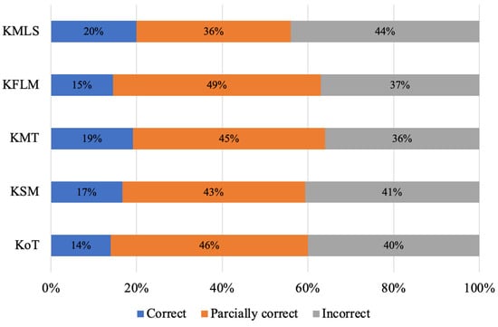 From the point of view of the different subdomains of the MTSK model, it can be seen that the results at the global level are low and do not exceed, on average, 17% of correct answers. It is also observed that the KMLS and KMT subdomains obtained the highest percentages of correct answers, 20% and 19%, respectively. On the other hand, the KoT and KFLM subdomains were the most difficult for the teachers participating in this study, with 14% and 15% of correct answers, respectively.